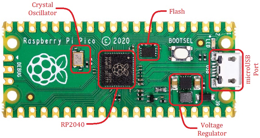 The Raspberry Pi Pico comes with the RP2040 μC, a 2MB external flash memory, a microUSB port and some power regulation components as shown below. We’ll discuss the BOOTSEL